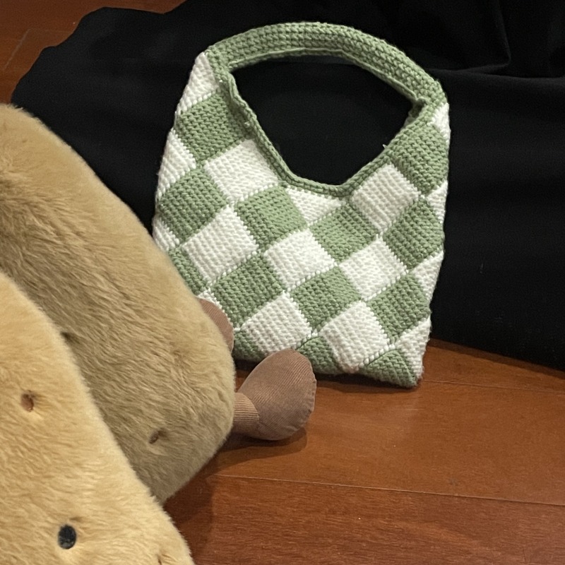 This hand-knitted checkered tote bag is a stylish accessory that combines practicality with fashion. Crafted from soft cotton yarn, it showcases a unique knit texture and exquisite craftsmanship.